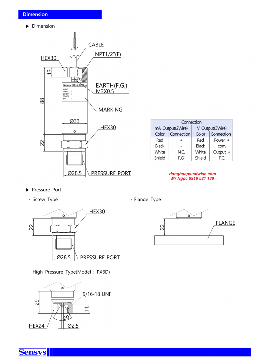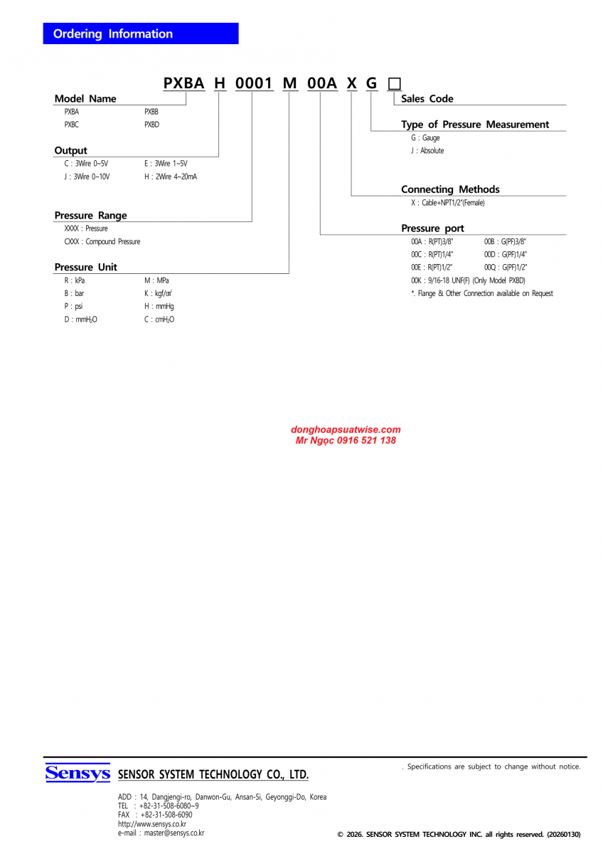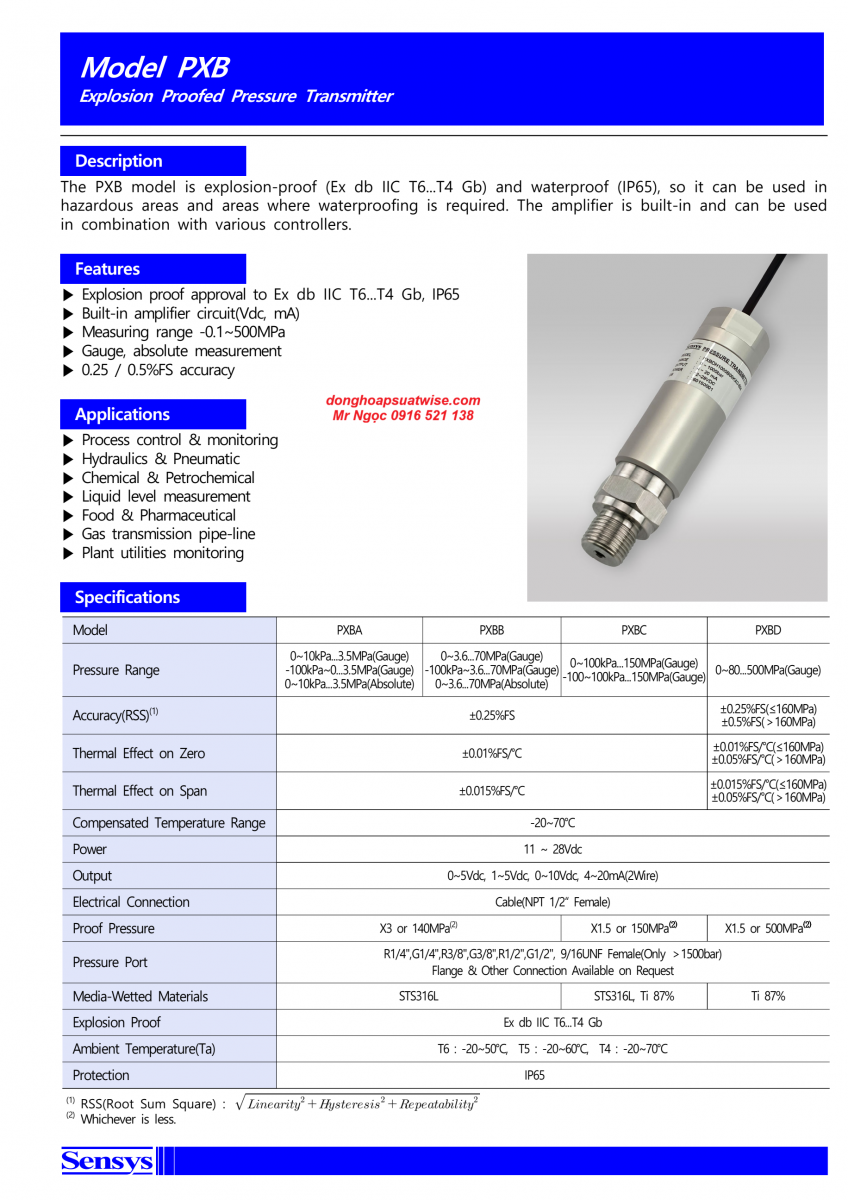 Thông số kỹ thuật cảm biến áp suất Sensys PXB
