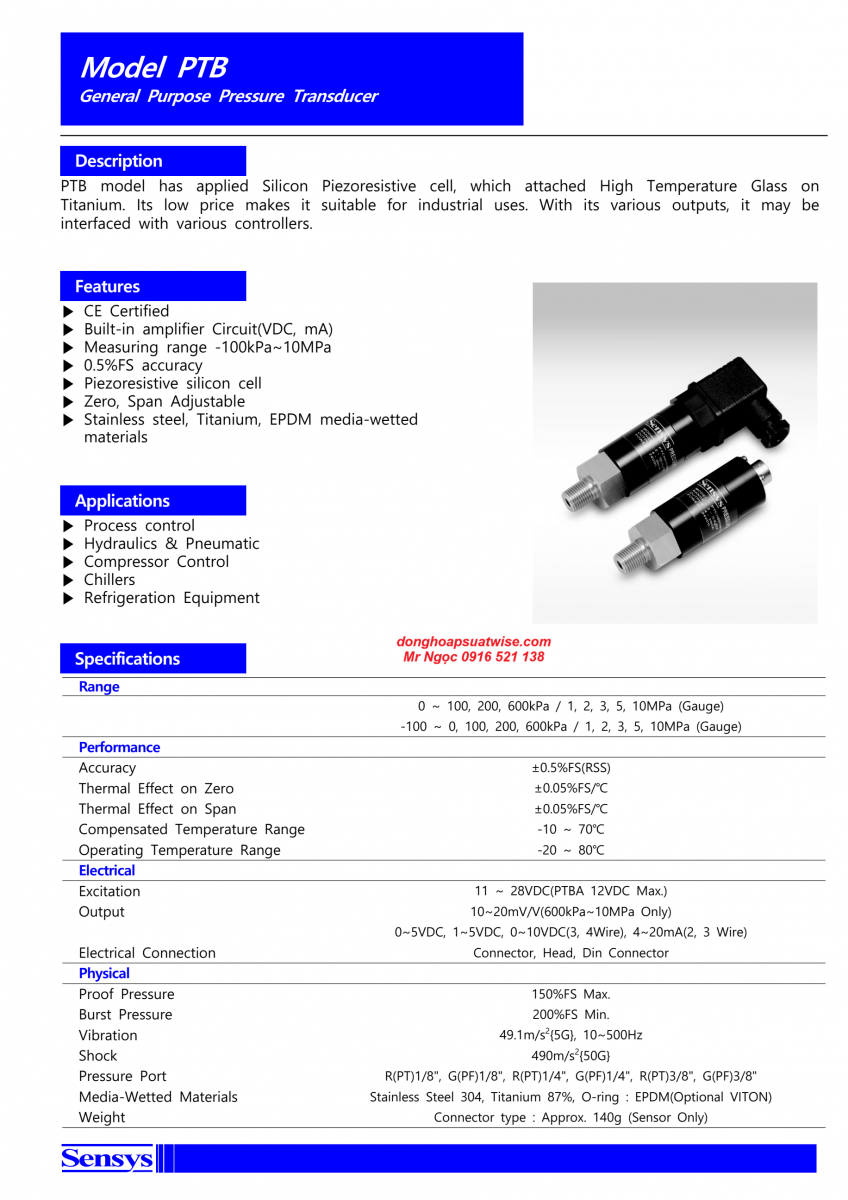 Thông số kỹ thuật cảm biến áp suất Sensys PTB