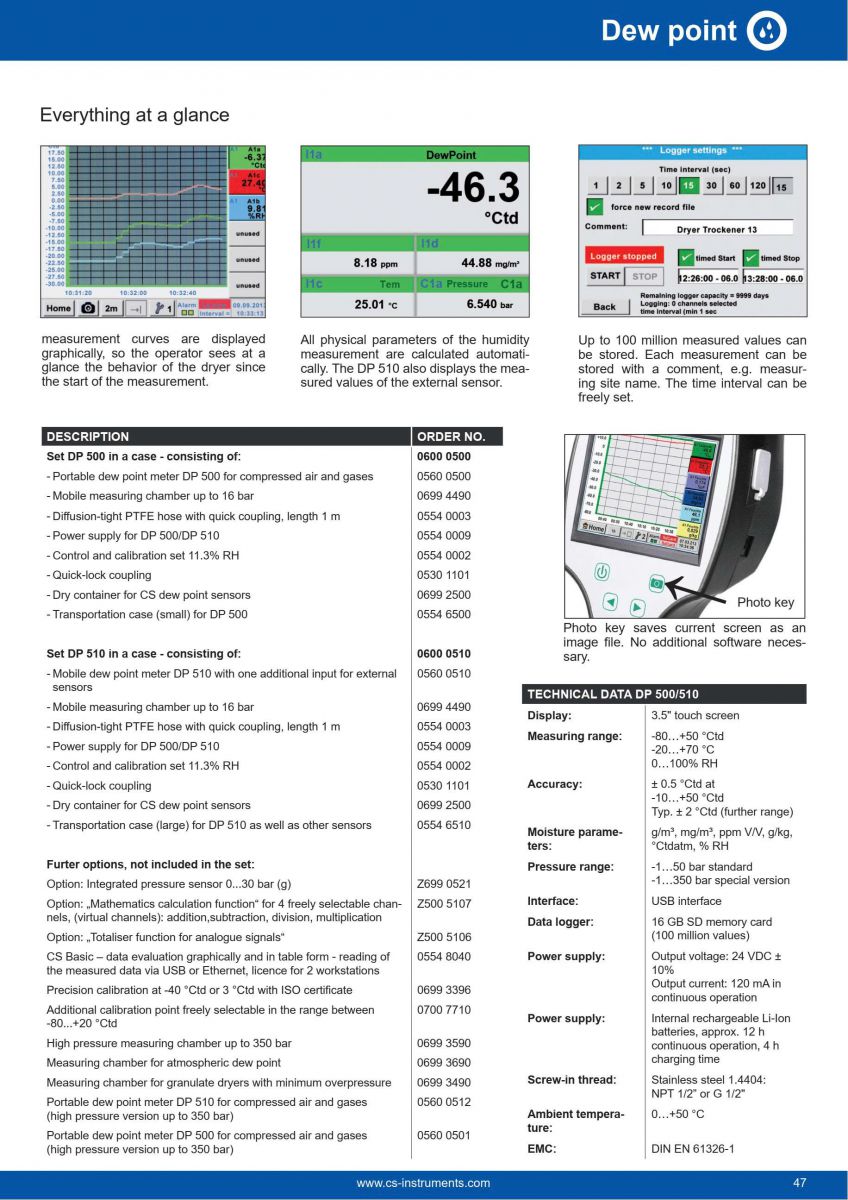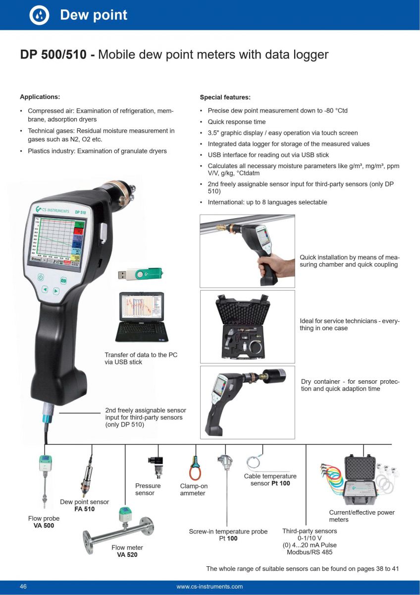 DP 500 là máy đo điểm sương (Dew Point) cầm tay, tích hợp bộ ghi dữ liệu (Data Logger) tiên tiến, được phát triển bởi hãng CS INSTRUMENTS (Đức). Thiết bị này là công cụ không thể thiếu cho các kỹ thuật viên dịch vụ và bảo trì, giúp kiểm tra nhanh chóng, chính xác và đáng tin cậy chất lượng khí nén và các loại khí kỹ th